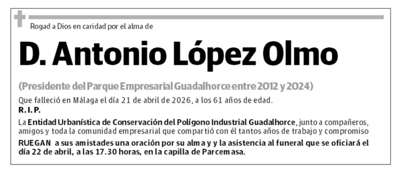 La Entidad de Conservación del Polígono Guadalhorce lamenta profundamente el fallecimiento de Antonio López Olmo (Granada, 1964), gerente de Covei y presidente de la entidad entre 2012 y 2024, ocurrido en la madrugada de este martes 21 de abril, cuando iba a cumplir 62 años el próximo 26 de abril. Vinculado desde hace décadas a Málaga, donde desarrolló su vida personal y profesional, Antonio López Olmo atravesaba desde hacía tiempo problemas cardiacos, circunstancia que motivó su salida de la presidencia en 2024 para reducir carga personal. En las últimas semanas había sido intervenido quirúrgicamente, pero una complicación cardiaca posterior no ha podido ser superada. El funeral tendrá lugar mañana, miércoles 22, a las 17.30 horas, en Parcemasa.